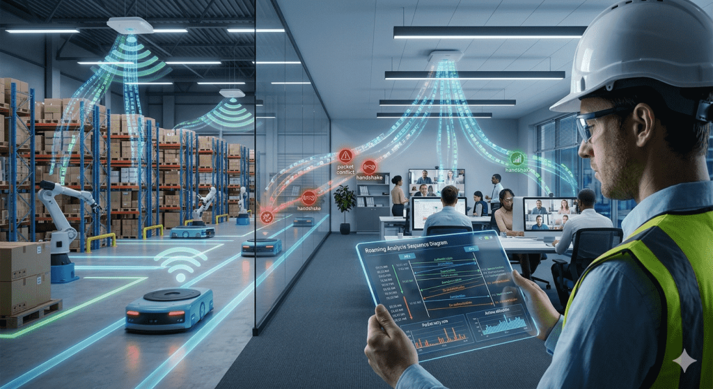 自動搬送ロボット(AGV)やノートPC、モバイル端末が移動する際、AP間の切り替え(ローミング)に失敗し、数秒間通信が切断される事象があります。既存ツールでは「いつ、どの認証プロセス(4-Way Handshake等)で失敗したか」をミリ秒単位で特定できません。結果、デバイスの故障を疑い修理に出しても「異常なし」。原因不明のまま稼働率が低下し続ける悪循環に陥っています。